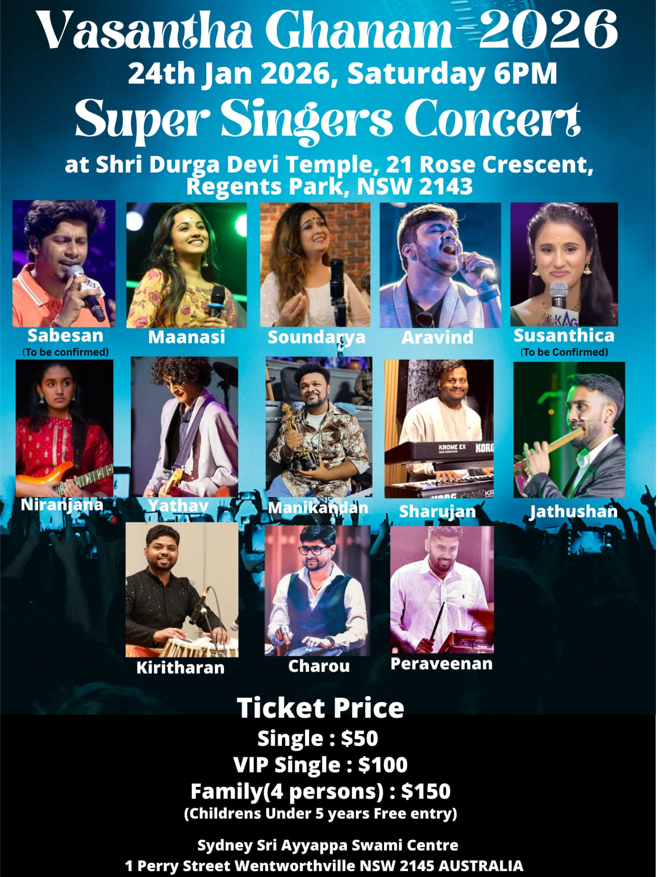 18+ in Event Government ID required at entryThe Super Singers Concert is a vibrant musical event that brings together top vocal talents from the popular reality show Super Singer. Celebrated for its electrifying performances and fan-favorite singers, the concert offers a dynamic blend of classical, folk, and contemporary music. Audiences can expect a high-energy experience as the finalists and winners showcase their vocal prowess live on stage, creating an unforgettable night of music and celebration for fans of all ages.